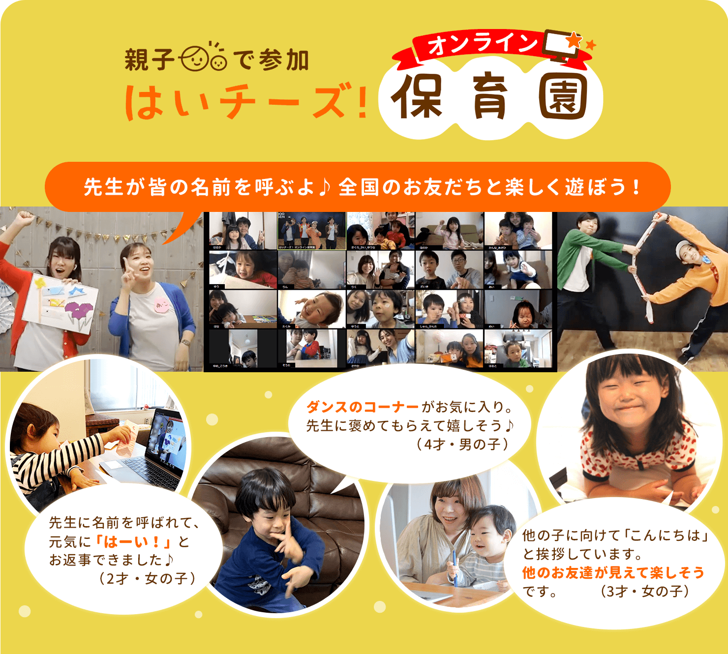 はいチーズ!オンライン保育園では、知的好奇心や探求心を育む、乳幼児期にふさわしい遊び・学びをオンラインで提供しています。