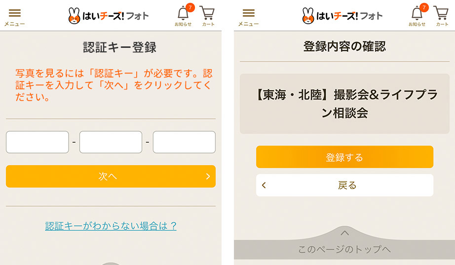 「認証キーを登録」の画面にて、約2週間後に送られる写真公開メールに記載の認証キーを入力します。
