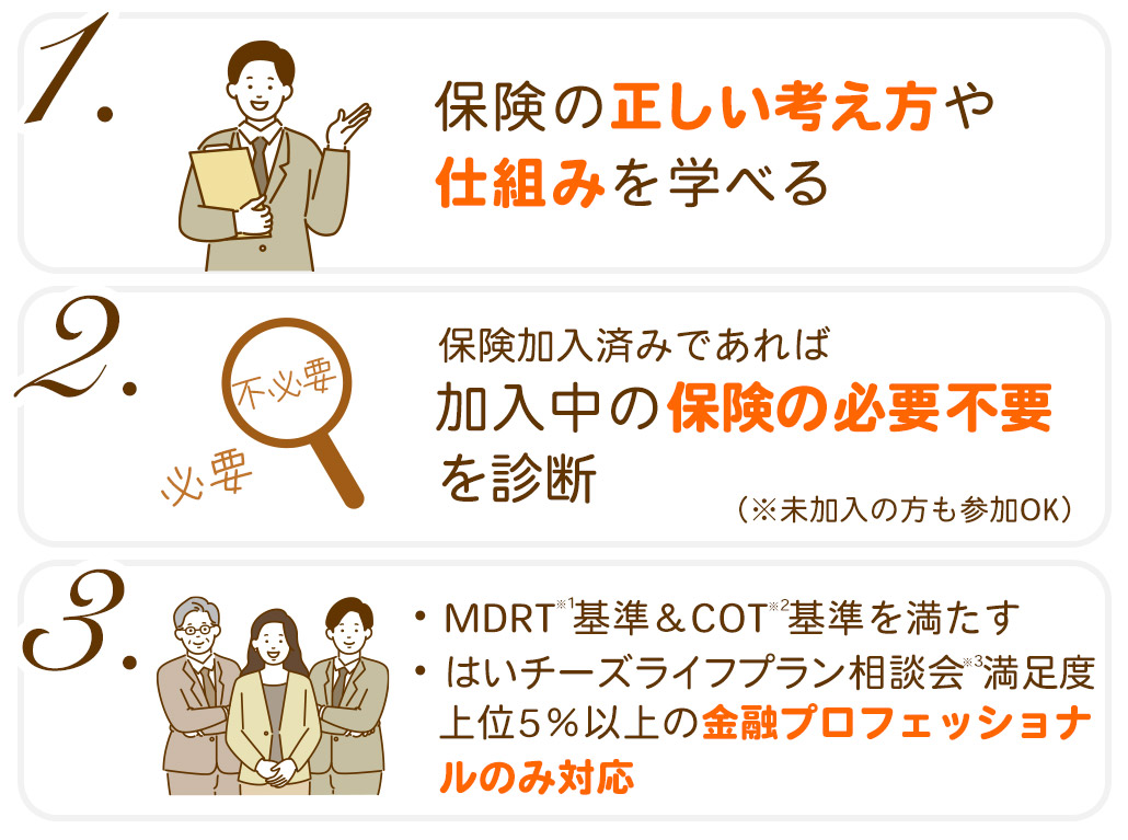 「正しい」保険加入のプランニングを信 念として「保険の過剰加入排除」「不要保 険の診断」を前提とした、透明度の高い コンサルティングを提供いたします。
