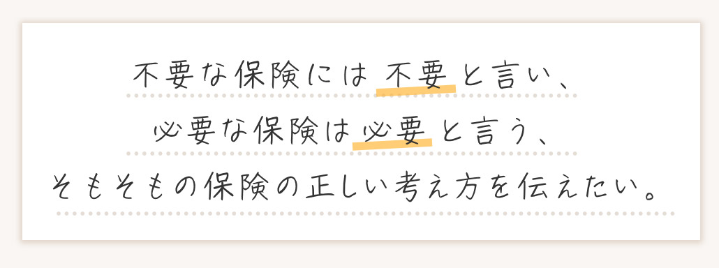 保険代理店は保険を売ることが商売ですが、「本来保険が不要な人が保険に入り、無駄なところに貴重なお金を使っていること」が問題だと思っています。